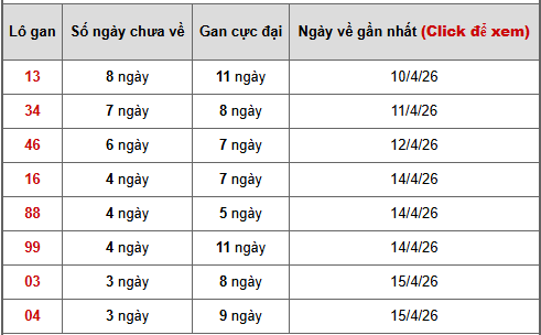 - Bảng thống kê lô gan Miền Nam ngày 19/4/2026