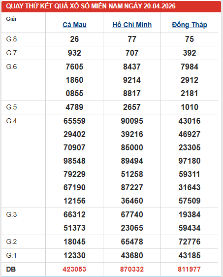 Theo dõi bảng quay thử xổ số miền Nam ngày 20/4/2026 để không bỏ lỡ những cơ hội vàng từ các con số tiềm năng. Kết hợp cập nhật dự đoán XSMN 20/4/2026 sẽ giúp bạn gia tăng độ chính xác khi chốt số.