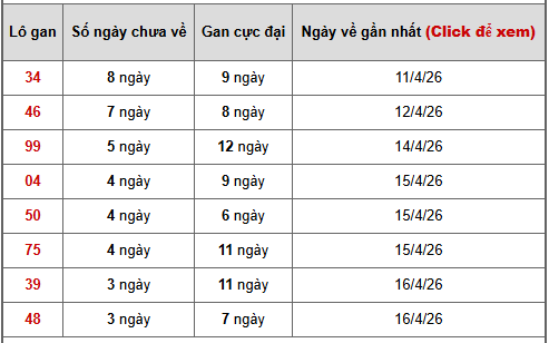 - Bảng thống kê lô gan Miền Nam ngày 20/4/2026