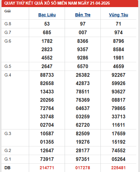 Theo dõi bảng quay thử xổ số miền Nam ngày 21/4/2026 để không bỏ lỡ những cơ hội vàng từ các con số tiềm năng. Kết hợp cập nhật dự đoán XSMN 21/4/2026 sẽ giúp bạn gia tăng độ chính xác khi chốt số.