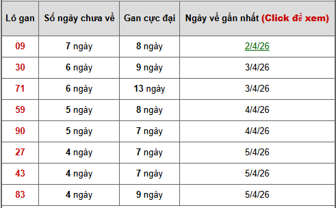 🔹30 và 71 cùng 6 ngày chưa về, trong đó 30 có cực đại 9 ngày, còn 71 lên tới 13 ngày → biên độ gan lớn, có thể tiếp tục đi hoặc bật về bất ngờ và thường được đưa vào bảng dự đoán xổ số miền Nam ngày 21 tháng 4 năm 2026 để theo dõi.