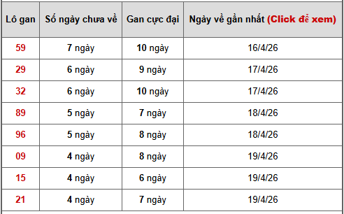 - Bảng thống kê lô gan Miền Nam ngày 24/4/2026