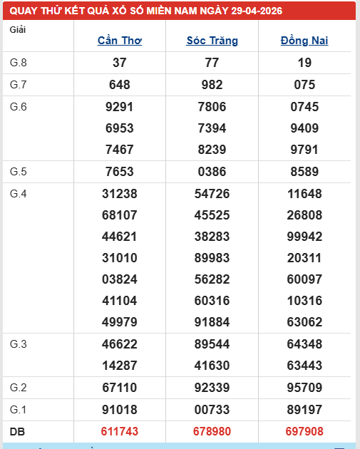 Đừng bỏ qua bảng quay thử xổ số miền Nam ngày 29/4/2026 để cập nhật những con số triển vọng. Khi kết hợp với nhận định XSMN 29/4/2026, bạn sẽ có thêm cơ sở để chọn số hiệu quả hơn.