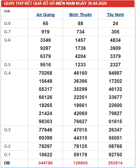 Đừng bỏ lỡ bảng quay thử xổ số miền Nam ngày 30/4/2026 để nắm bắt các con số tiềm năng. Kết hợp cùng dự đoán XSMN 30/4/2026 sẽ giúp bạn tăng cơ hội chọn số chính xác hơn.
