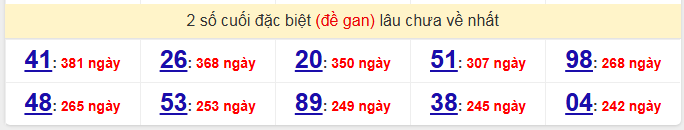 - Thống kê 2 số cuối giải đặc biệt lâu chưa xuất hiện nhất: 41 (381 lần), 26 (367 lần), 20 (350 lần), 51 (307 lần), 98 (268 lần)