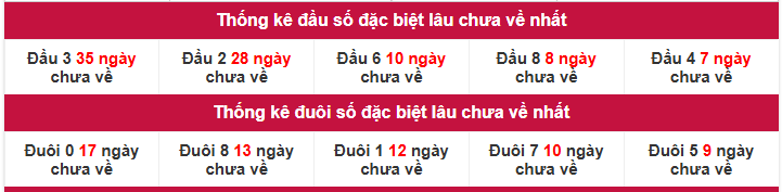 - Thống kê đầu giải đặc biệt MB lâu chưa ra: Đầu 3: 35 ngày, Đầu 2: 28 ngày, Đầu 6: 10 ngày, Đầu 8: 8 ngày, Đầu 4: 7 ngày