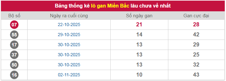 - Lô gan miền Bắc lâu chưa xuất hiện: 07 - 55 - 17 - 37 - 50