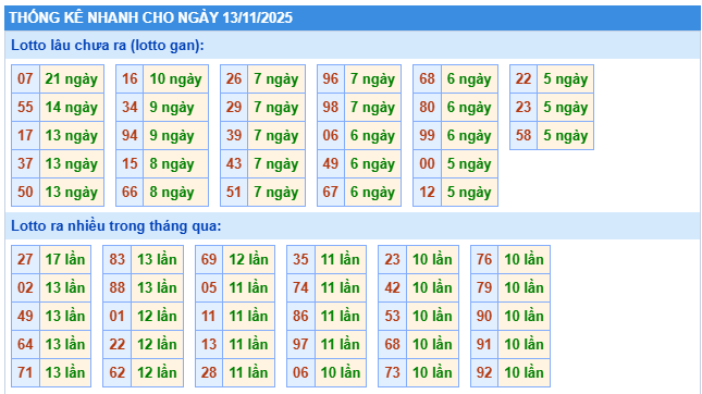 Thống kê lô tô Xổ số miền Bắc hôm nay 13/11/2025: