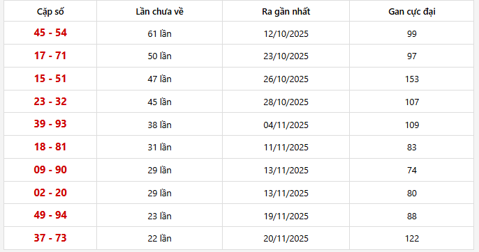 ⭐️ Cặp lô khan XSMB ít về nhất: 45 - 54 (61 lần), 17 - 71 (50 lần), 15 - 51 (47 lần), 23 - 32 (45 lần), 39 - 93 (38 lần)