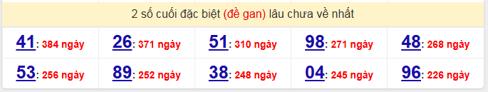 - Thống kê 2 số cuối giải đặc biệt lâu chưa xuất hiện nhất: : 41 (384 lần), 26 (370 lần), 20 (353 lần), 51 (310 lần), 98 (271 lần)