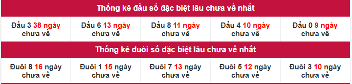 - Thống kê đầu giải đặc biệt MB lâu chưa ra: Đầu 3: 38 ngày, Đầu 6: 13 ngày, Đầu 8: 11 ngày, Đầu 4: 01 ngày, Đầu 0: 9 ngày