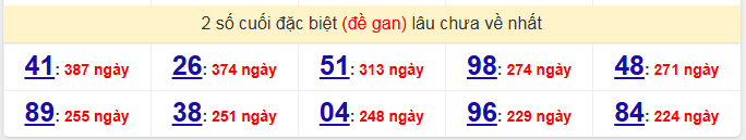 - Thống kê 2 số cuối giải đặc biệt lâu chưa xuất hiện nhất: 41 (387 lần), 26 (375 lần), 51 (313 lần), 98 (274 lần), 48 (272 lần)