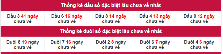 - Thống kê đầu giải đặc biệt MB lâu chưa ra: Đầu 3: 41 ngày, Đầu 6: 16 ngày, Đầu 8: 14 ngày, Đầu 4: 13 ngày, Đầu 0: 12 ngày