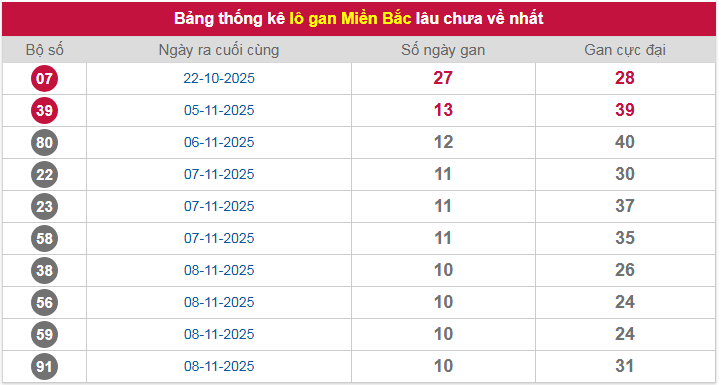 - Lô gan miền Bắc lâu chưa xuất hiện: 07 - 39 - 80 - 22 -23