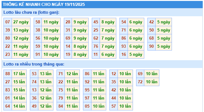Thống kê lô tô Xổ số miền Bắc hôm nay 19/11/2025: