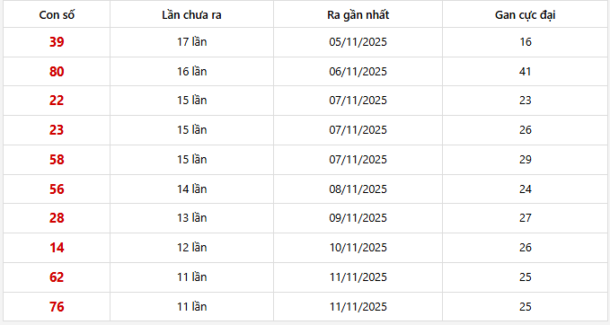 - Cặp số 80 đã 16 ngày chưa ra, cực đại là 40 ngày (từ 29/05/2023 đến 07/07/2023)