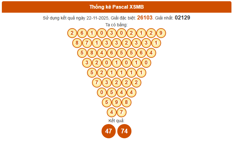 Trong thời gian gần đây, phương pháp Pascal đã trở thành công cụ dự đoán quen thuộc của nhiều người chơi xổ số miền Bắc. Bảng Pascal hôm nay liệu sẽ hé lộ con số may mắn cho kỳ quay 22/11/2025? Cùng xem chi tiết ở phần tiếp theo.