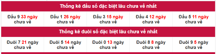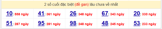 - Thống kê 2 số cuối giải đặc biệt lâu chưa xuất hiện nhất: 10 (558 lần), 41 (361 lần), 26 (348 lần), 67 (343 lần), 20 (330 lần)