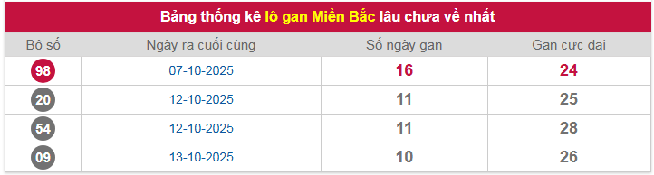 - Lô gan miền Bắc lâu chưa xuất hiện: 98 - 20 - 54 - 09
