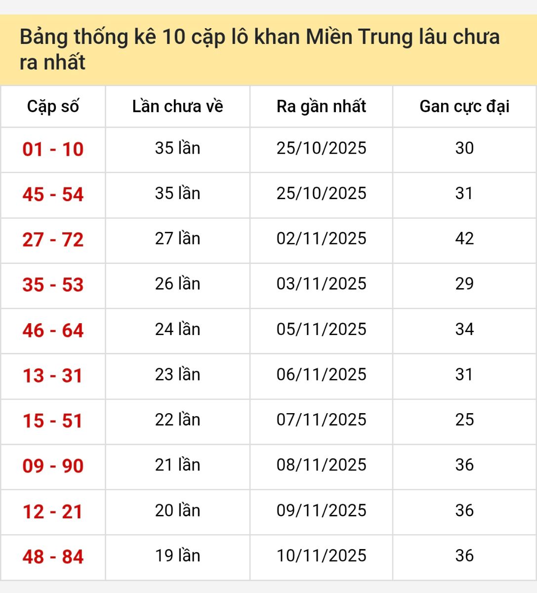⭐️ Cặp lô khan XSMB ít về nhất: 01 - 10 (35 lần), 45 - 54 (47 lần), 07 - 70 (27 lần), 27 - 72 (35 lần), 35 - 53 (26 lần)