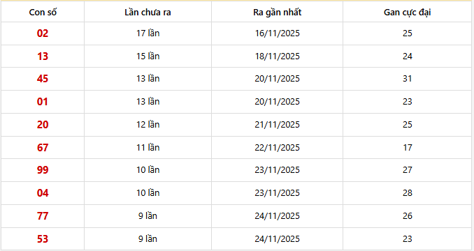 ⭐️ Cặp số lâu xuất hiện nhất XSMB (30 kỳ quay): 02 - 13 - 45 - 01 - 20