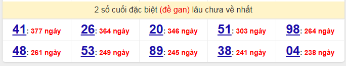 - Thống kê 2 số cuối giải đặc biệt lâu chưa xuất hiện nhất: 41 (377 lần), 26 (363 lần), 20 (346 lần), 51 (303 lần), 98 (264 lần)