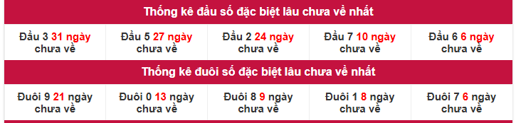 - Thống kê đầu giải đặc biệt MB lâu chưa ra: Đầu 3: 31 ngày, Đầu 5: 27 ngày, Đầu 2: 24 ngày, Đầu 7: 10 ngày, Đầu 6: 6 ngày