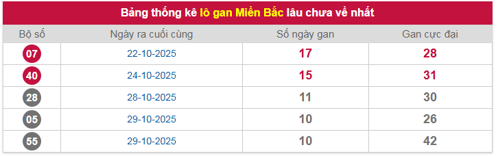 - Lô gan miền Bắc lâu chưa xuất hiện: 07 - 40 - 28 - 05 - 55