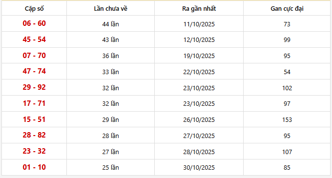 ⭐️ Cặp lô khan XSMB ít về nhất: 06 - 60 (44 lần), 45 - 54 (43 lần), 07 - 70 (36 lần), 47 - 74 (33 lần), 29 - 92 (32 lần)