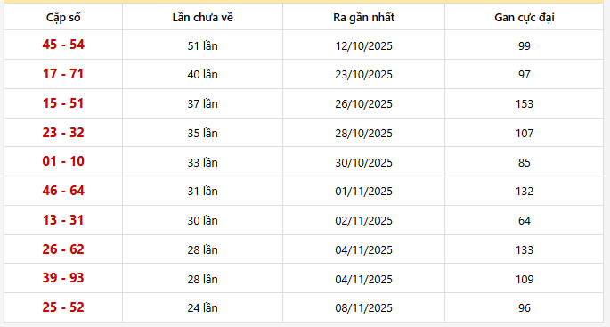 ⭐️ Cặp lô khan XSMB ít về nhất: 45 - 54 (51 lần), 29 - 92 (40 lần), 17 - 71 (40 lần), 15 - 51 (37 lần), 23 - 32 (35 lần)