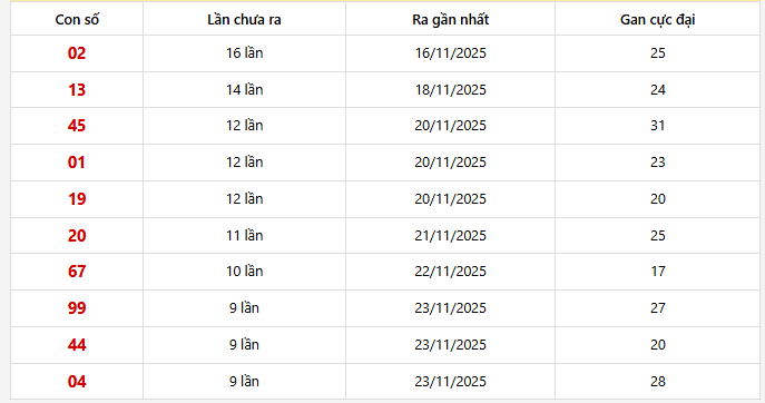 - Cặp số 02 đã 16 ngày chưa ra, cực đại là 22 ngày (từ 07/04/2025 đến 28/04/2025)