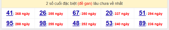 - Thống kê 2 số cuối giải đặc biệt lâu chưa xuất hiện nhất: 41 (368 lần), 26 (355 lần), 67 (350 lần), 20 (337 lần), 51 (294 lần)