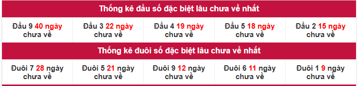 - Thống kê đầu giải đặc biệt MB lâu chưa ra: Đầu 9: 40 ngày, Đầu 3: 22 ngày, Đầu 4: 19 ngày, Đầu 5: 18 ngày, Đầu 2: 15 ngày