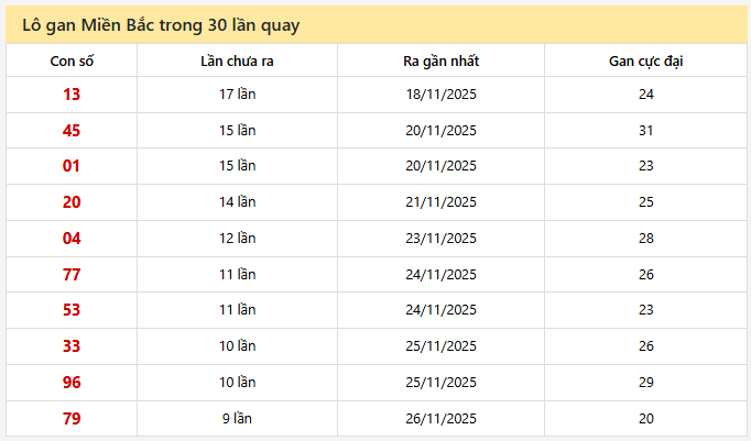 ⭐️ Cặp số lâu xuất hiện nhất XSMB (30 kỳ quay): 13 - 45 - 01 - 20 - 04 - 77