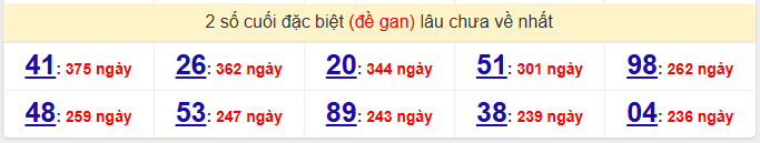 - Thống kê 2 số cuối giải đặc biệt lâu chưa xuất hiện nhất: 41 (375 lần), 26 (362 lần), 20 (344 lần), 51 (301 lần), 98 (262 lần)