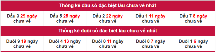 - Thống kê đầu giải đặc biệt MB lâu chưa ra: Đầu 3: 29 ngày, Đầu 5: 25 ngày, Đầu 2: 22 ngày, Đầu 1: 11 ngày, Đầu 7:8 ngày