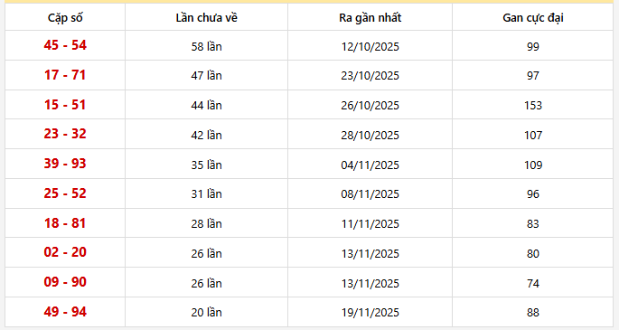 ⭐️ Cặp lô khan XSMB ít về nhất: 45 - 54 (58 lần), 17 - 71 (47 lần), 15 - 51 (44 lần), 23 - 32 (42 lần), 39 - 93 (35 lần)