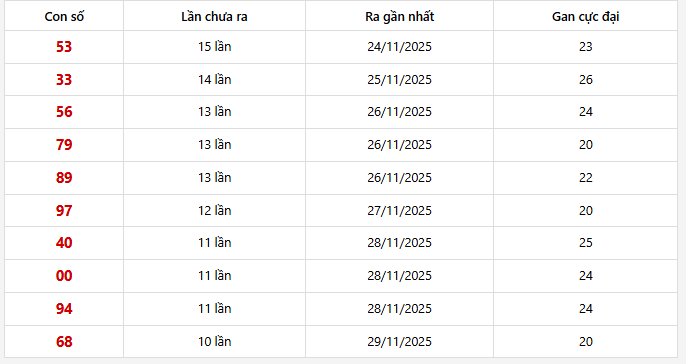 - Cặp số 53 đã 14 ngày chưa ra, cực đại là 25 ngày (từ 20/10/2019 đến 13/11/2019)