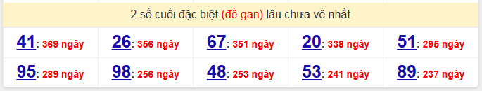- Thống kê 2 số cuối giải đặc biệt lâu chưa xuất hiện nhất: 41 (369 lần), 26 (356 lần), 67 (351 lần), 20 (338 lần), 51 (295 lần)