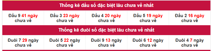 - Thống kê đầu giải đặc biệt MB lâu chưa ra: Đầu 9: 41 ngày, Đầu 3: 23 ngày, Đầu 4: 20 ngày, Đầu 5: 19 ngày, Đầu 2: 16 ngày