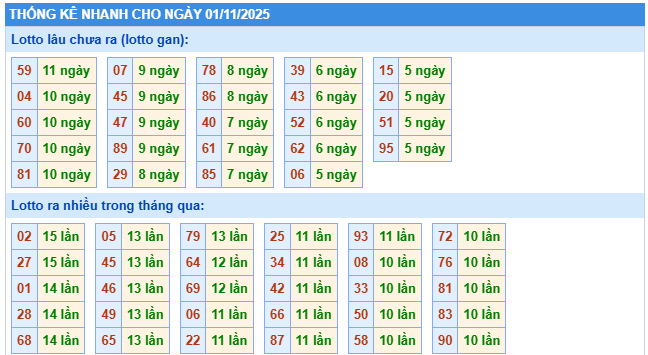 Dựa trên số liệu thống kê và tham khảo miền Bắc ngày 1/11, chuyên gia xổ số đưa ra phân tích về các số lô có tỷ lệ xuất hiện cao nhất trong kết quả XSMB 1/11/2025 như sau:
