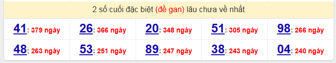 - Thống kê 2 số cuối giải đặc biệt lâu chưa xuất hiện nhất: 41 (379 lần), 26 (365 lần), 20 (348 lần), 51 (305 lần), 98 (266 lần)