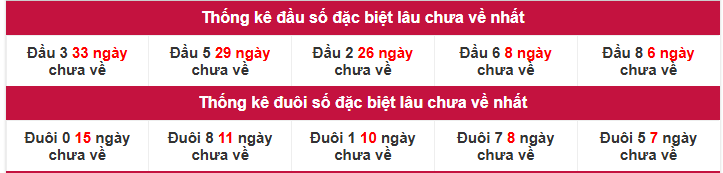 - Thống kê đầu giải đặc biệt MB lâu chưa ra: Đầu 3: 33 ngày, Đầu 5: 29 ngày, Đầu 2: 26 ngày, Đầu 6: 8 ngày, Đầu 8: 6 ngày