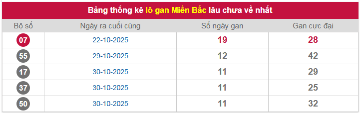 - Lô gan miền Bắc lâu chưa xuất hiện: 07 - 55 - 17 - 37 - 50