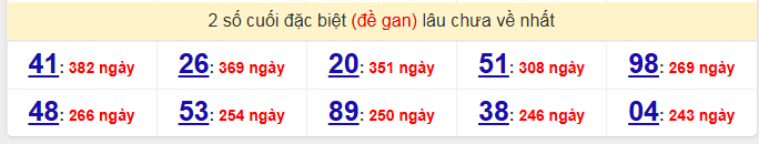 - Thống kê 2 số cuối giải đặc biệt lâu chưa xuất hiện nhất: 41 (382 lần), 26 (368 lần), 20 (351 lần), 51 (308 lần), 98 (269 lần)