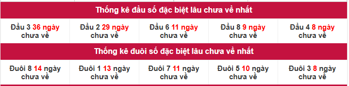 - Thống kê đầu giải đặc biệt MB lâu chưa ra: Đầu 3: 36 ngày, Đầu 2: 29 ngày, Đầu 6: 11 ngày, Đầu 8: 9 ngày, Đầu 4: 8 ngày
