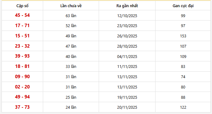 ⭐️ Cặp lô khan XSMB ít về nhất: 45 - 54 (63 lần), 17 - 71 (52 lần), 15 - 51 (49 lần), 23 - 32 (47 lần), 39 - 93 (40 lần)