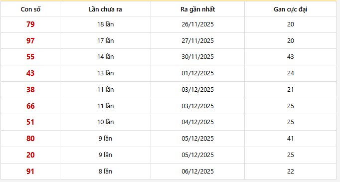 ⭐️ Cặp số lâu xuất hiện nhất XSMB (30 kỳ quay): 79 - 97 - 55 - 22 - 43 - 38