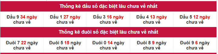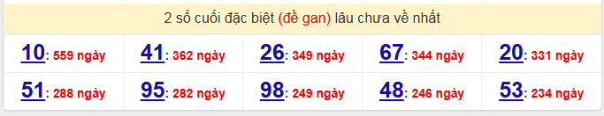- Thống kê 2 số cuối giải đặc biệt lâu chưa xuất hiện nhất: 10 (559 lần), 41 (362 lần), 26 (349 lần), 67 (344 lần), 20 (331 lần)