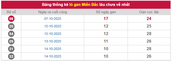 - Lô gan miền Bắc lâu chưa xuất hiện: 98 - 20 - 54 - 09 - 21 - 32
